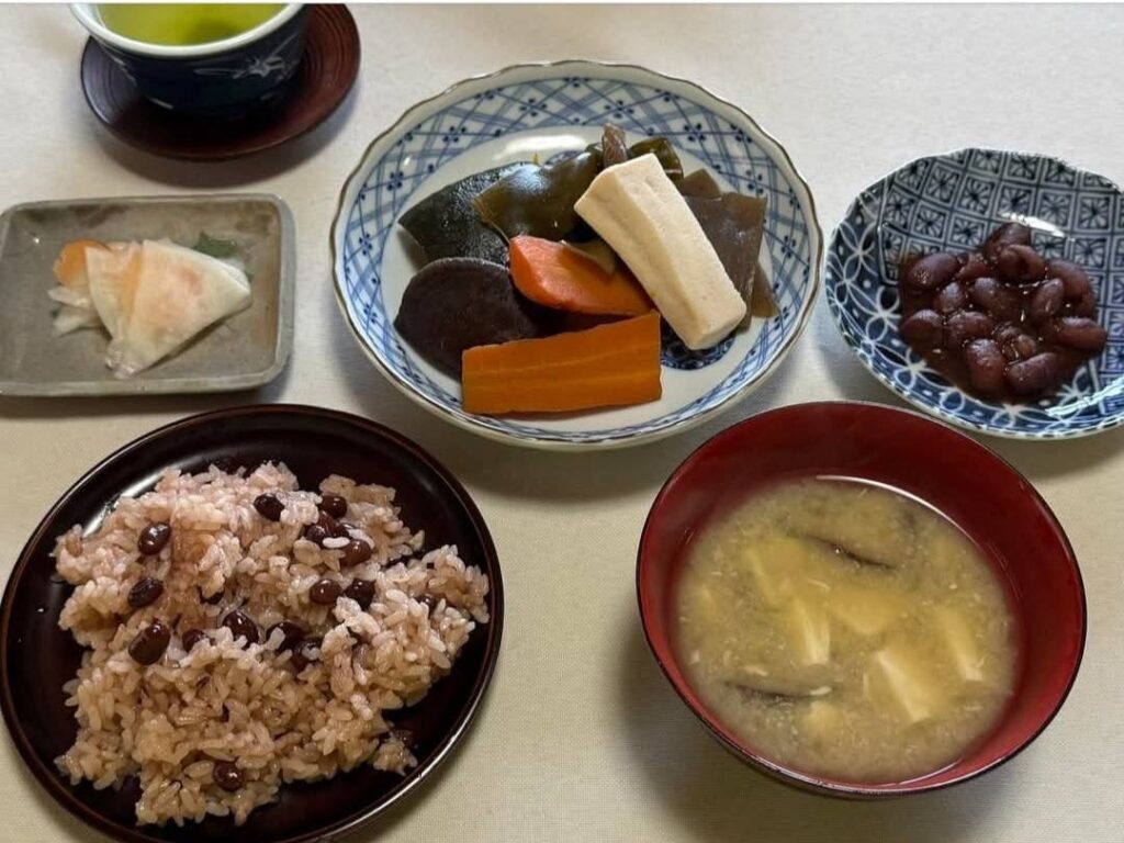 お赤飯、お煮しめ、紅白の蕪の酢の物、みそ汁、煮豆をお出しさせていただきました。